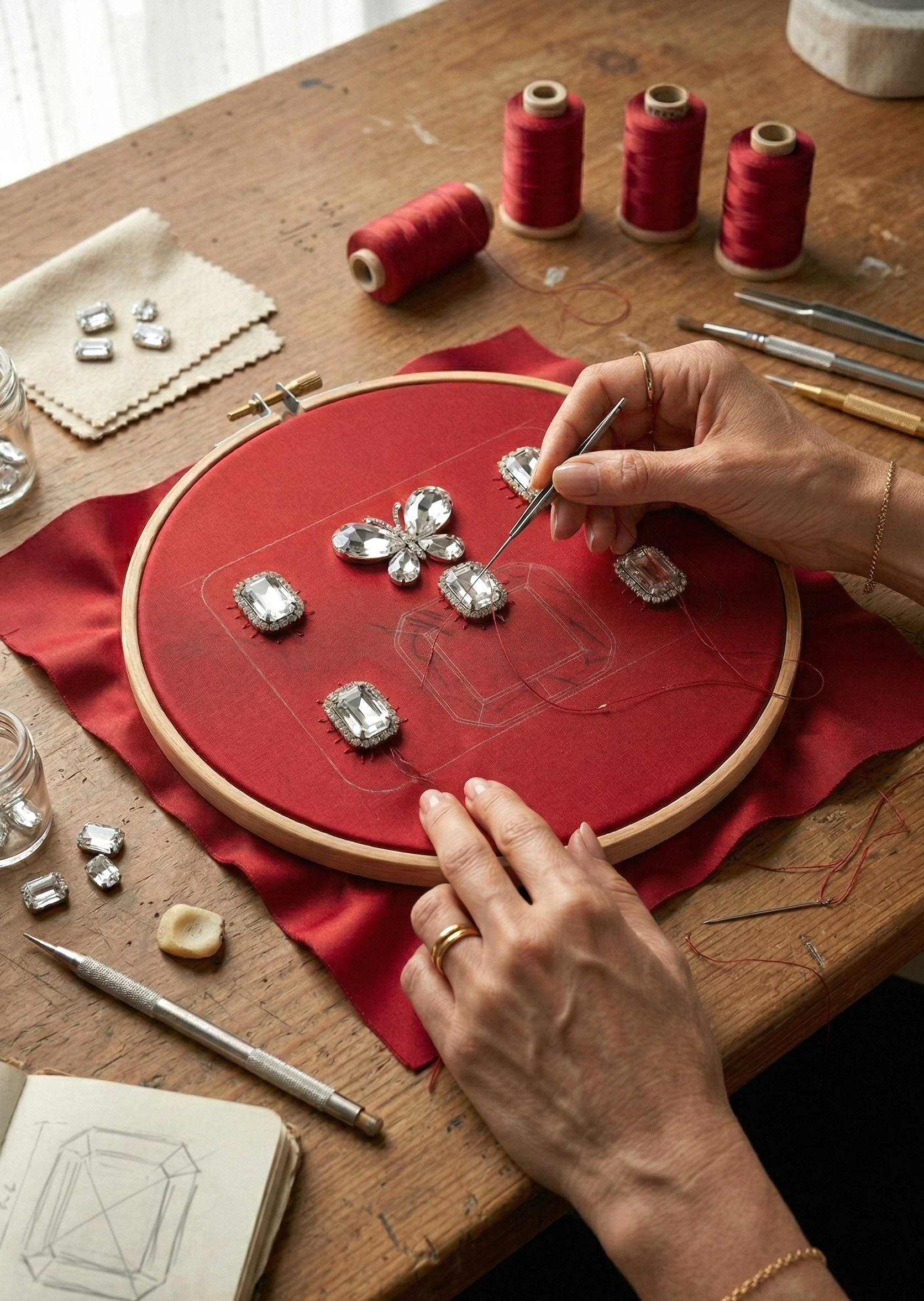 Bespoke Handbags: Custom-made silk and metal-framed evening clutches featuring intricate, hand-set rhinestone detailing.